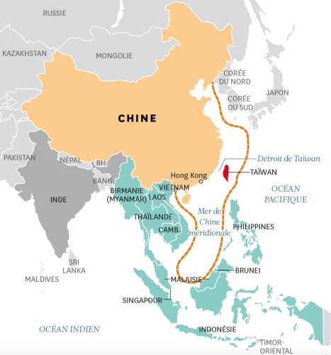 Il y a ensuite la question de Taïwan : la Chine ne considère pas Taïwan (Formose) comme un État indépendant. Pour la Chine, Taïwan est une province chinoise qui doit être restituée à l’autorité du gouvernement de Pékin. Mais abstraction faite des considérations nationalistes et des revendications territoriales, le contrôle de la grande île de Taïwan ouvrirait la voie à la marine chinoise vers l’océan Pacifique, et surtout, ferait du détroit de Taïwan un « canal chinois » contrôlant le trafic maritime entre le Japon et l’Asie du Sud-Est, et constituerait un atout majeur en cas de conflit sur les divers détroits.